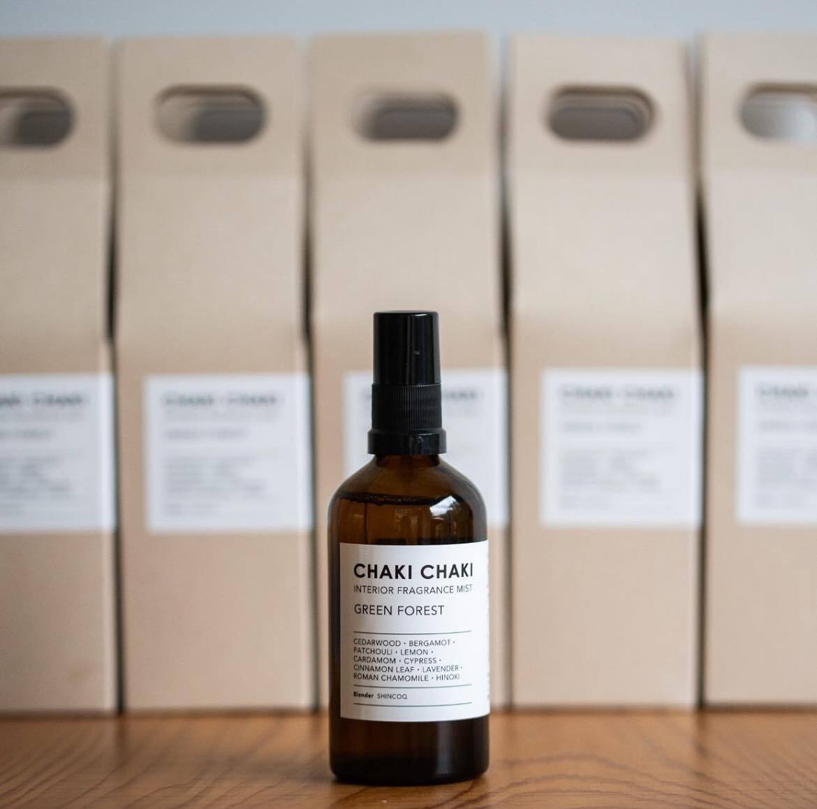 CHAKI CHAKIのテラスで森林浴をしているようなイメージをコンセプトに、エッセンシャルオイルブランド「SHINCOQ」と共同開発したオリジナルフレグランスミストです。シダーウッド、ベルガモット、パチュリ、レモンなどの精油を配合し、時間が経つごとに少しずつ香りの変化をお楽しみいただけます。